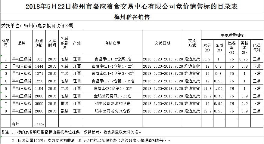 受客戶委托,梅州市嘉應(yīng)糧食交易中心有限公司定于2018年5月22日(星期二)舉辦糧食競價(jià)交易會,梅州市嘉泰糧食收儲公司擬銷售早秈稻13154噸。