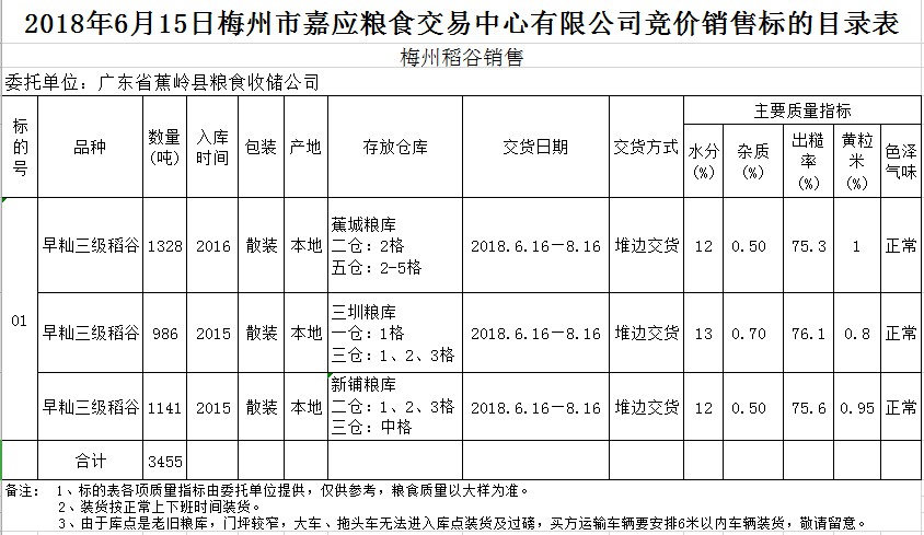 交易時間和地點(diǎn):2018年6月15日(星期五)上午10時15分。廣東省梅州市彬芳大道南161號梅州市糧食交易中心3樓。